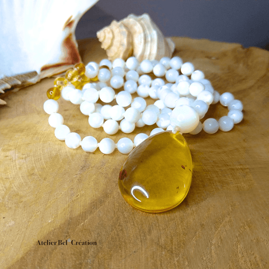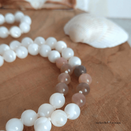 Collier long, Mala Pierre de lune Arc-en-ciel, Péristerite et nacre